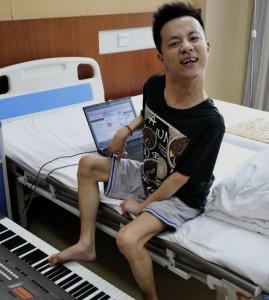 李传杰,家住安徽省霍邱县花园镇,为什么称为脑瘫达人?一、由于二十年前由于母亲意外早产,六个月大的传杰提前来到了这个世界,而后被确诊为痉挛型脑瘫。二、传杰是不幸的,无情的病魔剥夺了这个家庭的幸福,但他却靠自己执着与坚韧用脚趾弹奏出悦耳动听的音乐。