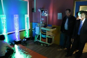 在CEO姚秋武和技术总监崔广利的带领下,Mark Vaile先生参观了感统室、视听房,积极参与、亲身体验,同正在接受指导的小朋友亲切打招呼,并对于东方启音的教具及互动的课程模式高度认可,在参观结束前,还为东方启音的公司愿景亲笔提名,“Talk to the world!”祝愿在东方启音的每一位宝宝都能轻松与世界对话。